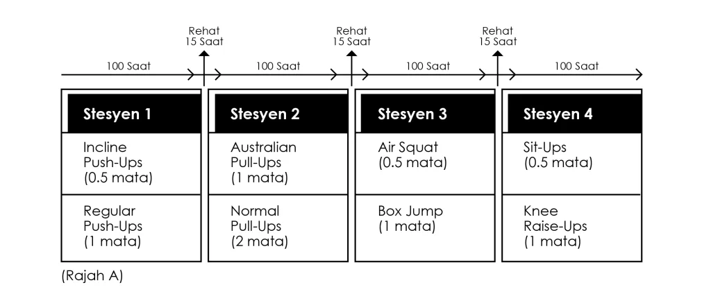 Setiap kumpulan akan bertanding kekuatan dan kepantasan melalui “๐ญ๐ฌ๐ฌ ๐ฆ๐ฒ๐ฐ๐ผ๐ป๐ฑ๐ ๐๐ฎ๐๐๐น๐ฒ”. Setiap kumpulan bebas merancang pergerakan ahli kumpulan untuk melaksanakan setiap 4 cabaran yang mana setiap stesyen akan diberi masa selama 100 saat (1 minit 40 saat) dengan rehat selama 15 saat antara stesyen (Rujuk Rajah A). Mata terkumpul tertinggi dalam kumpulan akan dinobatkan sebagai pemenang.