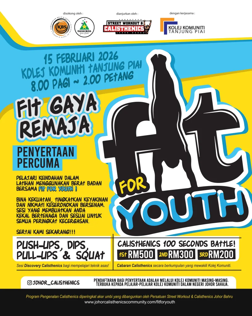 Satu program pendedahan serta cabaran senaman calisthenics melibatkan ๐ญ๐ฏ ๐๐ผ๐น๐ฒ๐ท ๐๐ผ๐บ๐๐ป๐ถ๐๐ถ ๐ฑ๐ถ ๐๐ฒ๐น๐๐ฟ๐๐ต ๐๐ผ๐ต๐ผ๐ฟ. Peserta akan belajar kaedah dan pendedahan terperinci kebaikan serta kelebihan setiap senaman calisthenics melalui bengkel “๐๐ถ๐๐ฐ๐ผ๐๐ฒ๐ฟ๐ ๐๐ฎ๐น๐ถ๐๐๐ต๐ฒ๐ป๐ถ๐ฐ๐”. Aktiviti akan dijalankan secara berkumpulan mewakili kolej komuniti masing-masing.